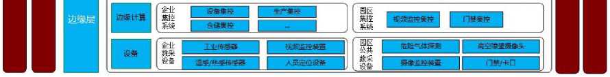 1.边缘层。边缘层通过对化工园区企业及公共管廊、公共 区域的监测监控设备与遥测设备等的网络化改造,或者加装网 络化智能化监控设备,通过协议转换、边缘计算等构建精准、 实时、高效的安全与应急数据采集与分析体系,接入、转换、 预处理、存储、分析数据,配置边缘网关等设备合理布置算力 和模型,实时获知企业及园区公共设备设施的运行状况和环境 动态变化,就近提供边缘智能服务,掌握安全态势。