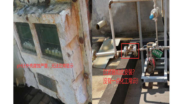 3.设备设施检查维护缺失。如某企业碱洗塔pH计外壳腐蚀严重,无法观察显示的数值。可能因碱液浓度低影响处理效果,造成RTO内部腐蚀,带来RTO设备变形、坍塌、废气泄漏等安全风险。pH计因长期在酸(碱)环境中工作,一般连续使用2个月后显示就会出现较大的误差,需要人工分析(或标注溶液校准)。另外,某企业燃料油泵过滤器装错方向,可能造成燃烧器喷嘴堵塞,影响RTO正常运行。