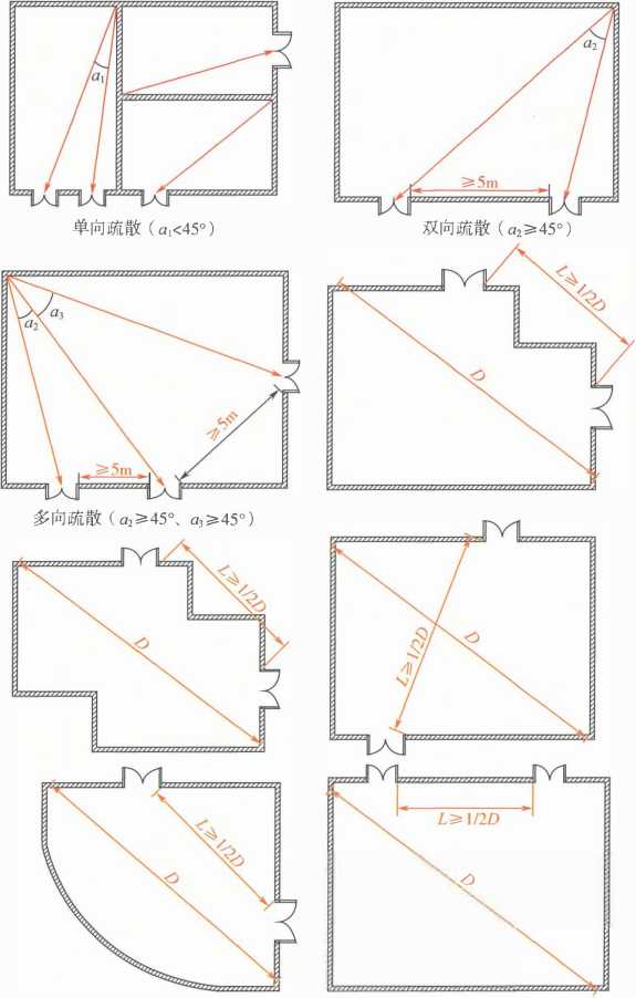 (1)疏散出口包括各类建筑中的安全出口、房间的疏散门, 以及城市综合管廊工程或其他管廊工程中的人员疏散出口等。 疏 散通道包括各类建筑(包括平时使用的人民防空工程)中的室外 疏散楼梯,房间或区域内规划用千人员通行和疏散的通道、疏散 走道、疏散坡道、避难走道和疏散楼梯间,地铁车站的出入口通 道、地铁区间隧道间的联络通道及其出入口、疏散平台,隧道内 的疏散通道及其出入口。