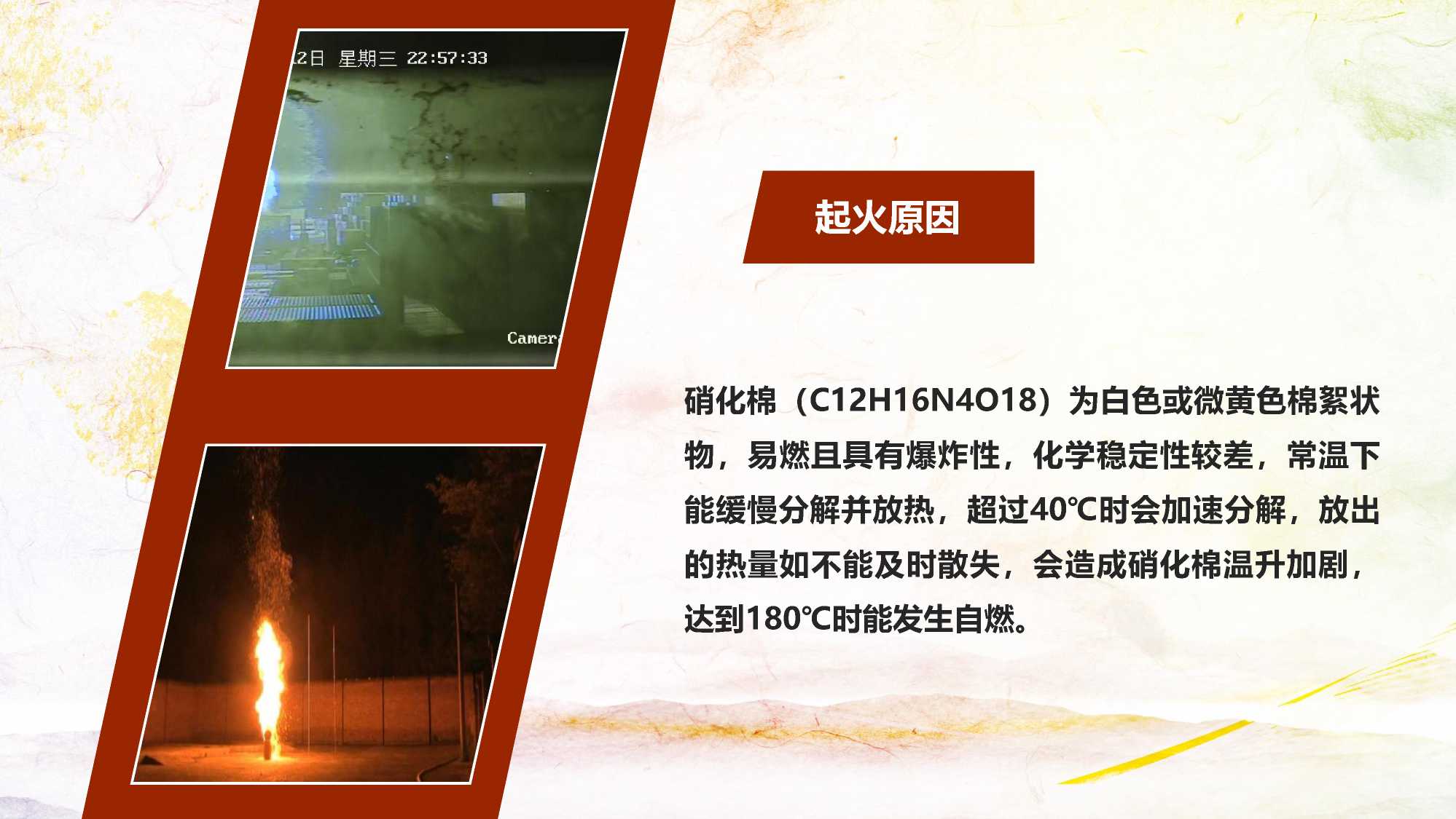 硝化棉(C12H16N4O18)为白色或微黄色棉絮状 物,易燃且具有爆炸性,化学稳定性较差,常温下 能缓慢分解并放热,超过40℃时会加速分解,放出 的热量如不能及时散失,会造成硝化棉温升加剧, 达到180℃时能发生自燃。