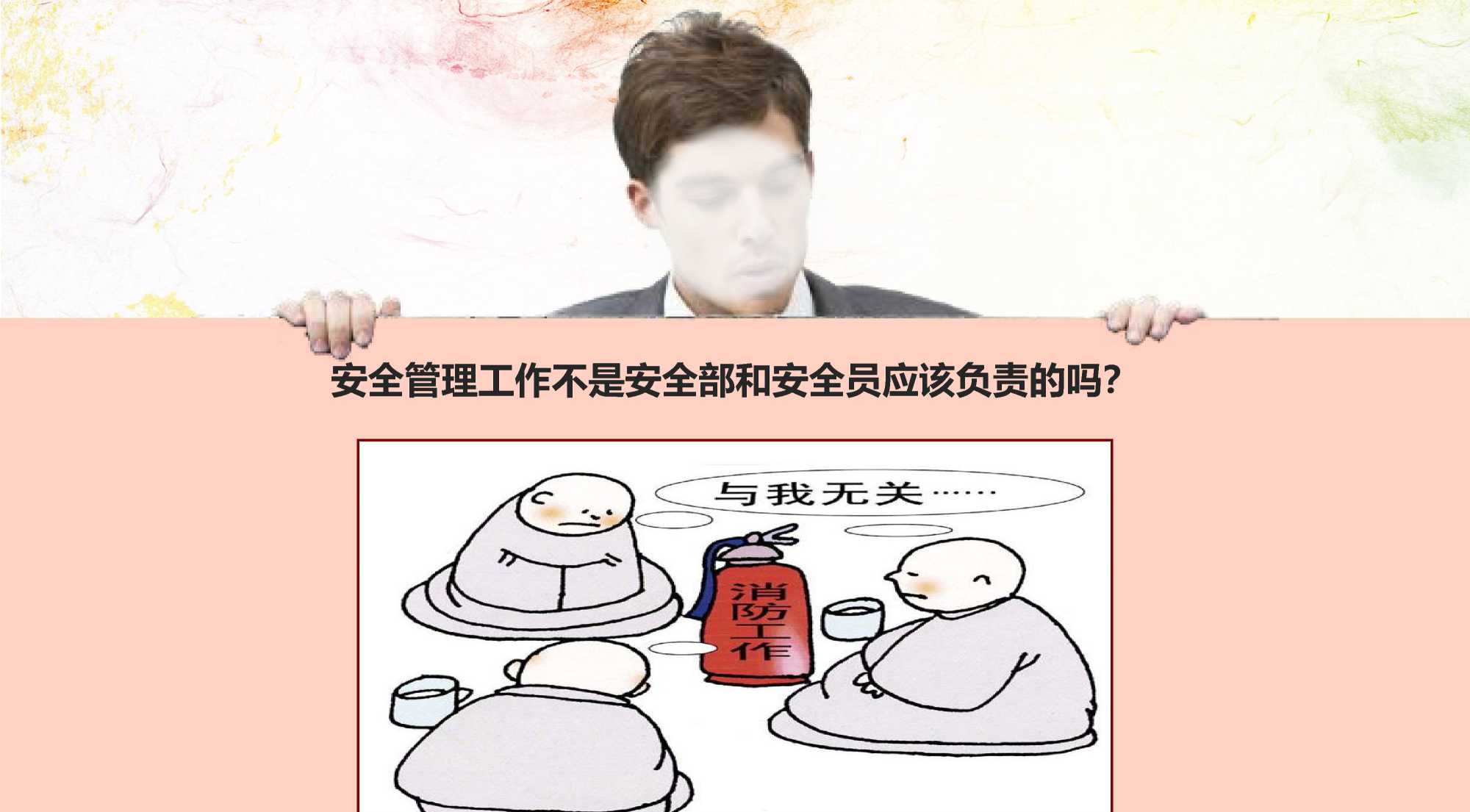 不分管安全的领导、机关职能部门及岗位人员要提高认识,在工作中仍需牢记并严格落实安 全职责,并彻底消除“安全工作是安全部门和安全专职管理人员的职责”的偏见。发挥专业 科室的作用。