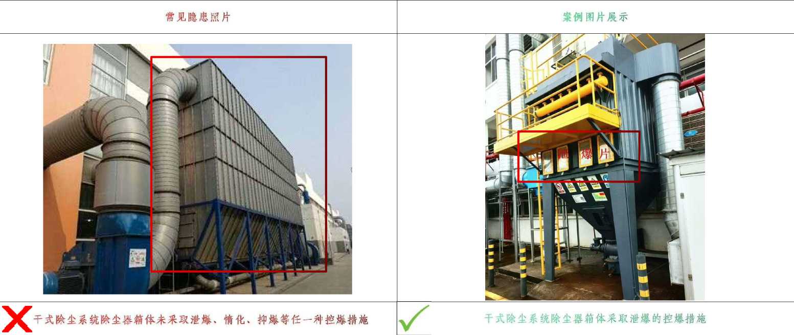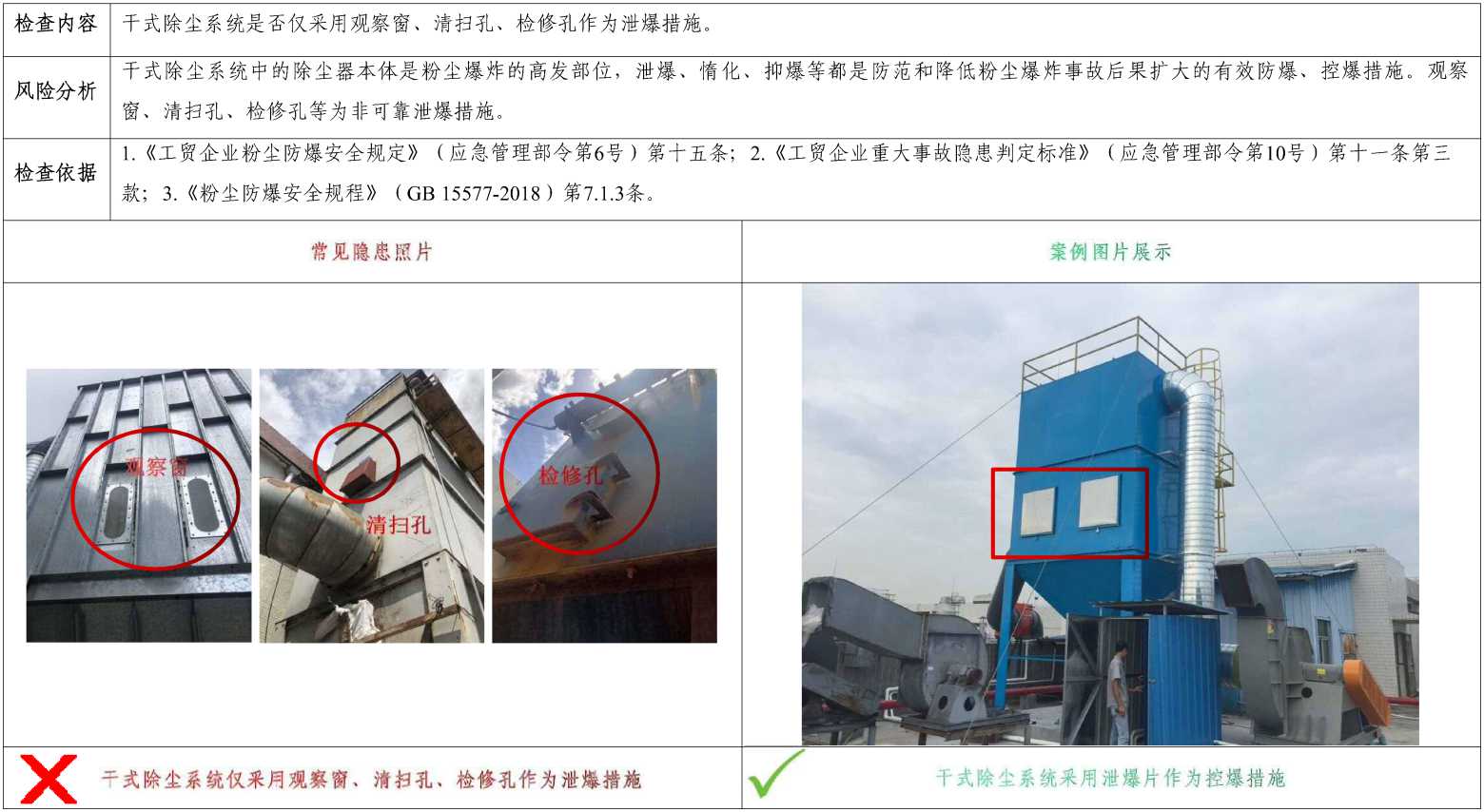 检查内容 干式除尘系统除尘器箱体是否采取泄爆、惰化、抑爆等任一种控爆措施。