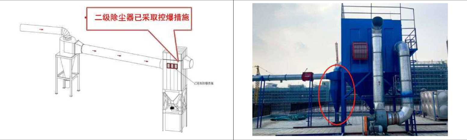 不同防火分区除尘系统互联互通,一旦发生粉尘爆炸,所有通过除尘系统连接的区域都会受到爆炸波及,导致事故的影响范围扩大,可能造成更多 的人员伤亡。