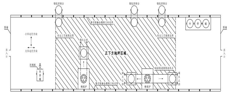 图1 红框内为正下方地坪区域,严禁设置六类人员聚集场所 (3) 炼钢厂位于车间架空层平台的转炉操作室,其面向铁水吊运侧未采用实体墙完全封闭。注:“实体墙”是指砖墙、混凝土墙或者采用耐火材料砌(浇)筑的墙体;“未采用实体墙完全封闭”是指操作室面向熔融金属吊运侧的出入门、观察窗未采用实体墙完全封闭。 (4) 炼钢厂架空层平台的AOD炉、VD炉、VOD炉的操作室,其面向铁水、钢水吊运侧未采用实体墙完全封闭的外墙,在铁水罐、钢水罐吊运跨靠近熔融金属吊运侧的立柱边线以内。 (5) 炼钢厂连铸流程采用钢水罐水平连浇车或者钢包回转台单跨布置的连铸平台操作室,其面向钢水、液渣吊运侧未采用实体墙完全封闭的外墙,在连铸平台靠近熔融金属吊运侧的立柱边线以内。注:面向钢水、液渣吊运侧包括正对连铸跨和面向钢水罐行走路线两个方向。 (6) 炼钢厂钢水罐冷(热)修工位、铁水罐冷修工位设置在铁水、钢水、液渣吊运行走区域的正下方地坪区域内,或者设置在吊运跨纵向最两端时,未满足安全防护要求。注:“安全防护要求”是指钢水罐冷(热)修工位、铁水罐冷修工位的罐体外壁(靠近罐体吊运工艺极限边界一侧),与熔融金属吊运工艺极限边界间距大于等于15米;钢水罐热修工位靠近熔融金属吊运侧还需设置高度大于等于2米,宽度超出热修操作工位1米以上的实体墙;实体墙与吊运工艺极限边界的距离应大于等于13米。