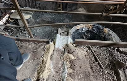 (1) 事故钢水罐设置情况,重点关注: n 是否设置事故钢水罐; n *罐体容量是否满足要求(如图1); n *罐体内是否有残渣和杂物; n *摆放位置是否位于回转位置正下方; n *罐体和耳轴是否进行检测; n 地面是否存在积水; n *罐体是否存在缺陷,底部引流口是否填充引流沙。 (2) 中间罐溢流坑(槽)设置情况,重点关注: n 是否设置溢流坑(槽)(如图2); n 溢流坑(槽)内是否有积水 n *溢流坑(槽)设置位置能否有效收集中间罐溢流; n *溢流坑(槽)内是否有杂物、潮湿。 (3) 漏钢回转溜槽设置情况,重点关注: n 是否设置漏钢回转溜槽; n *槽体是否使用钢板焊接,内部使用耐火砖或者耐火材料砌筑,砌筑体是否松脱破损(如图3、图4); n *漏钢回转溜槽设置是否在钢包水口回转范围; n *漏钢回转溜槽是否有残渣和杂物; n *溜槽末端延伸至事故钢水罐上方(如图4)。 |