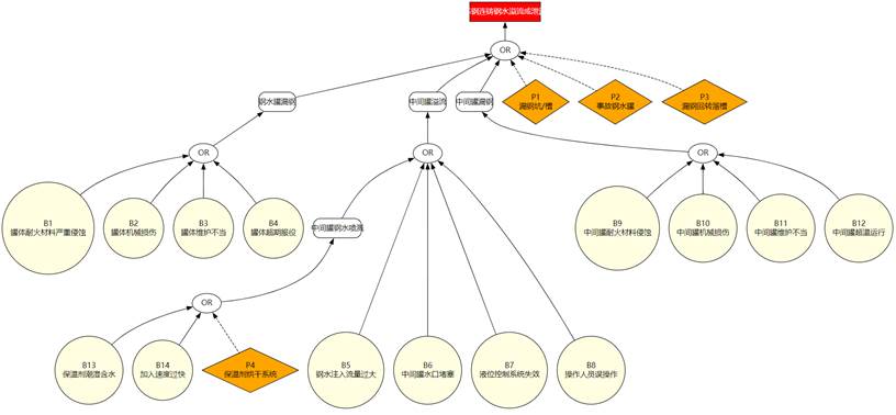 以“炼钢连铸钢水溢流或泄漏”为顶事件进行故障树分析 |