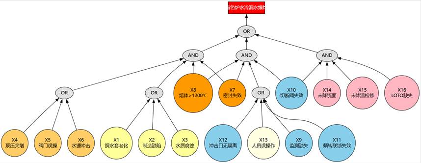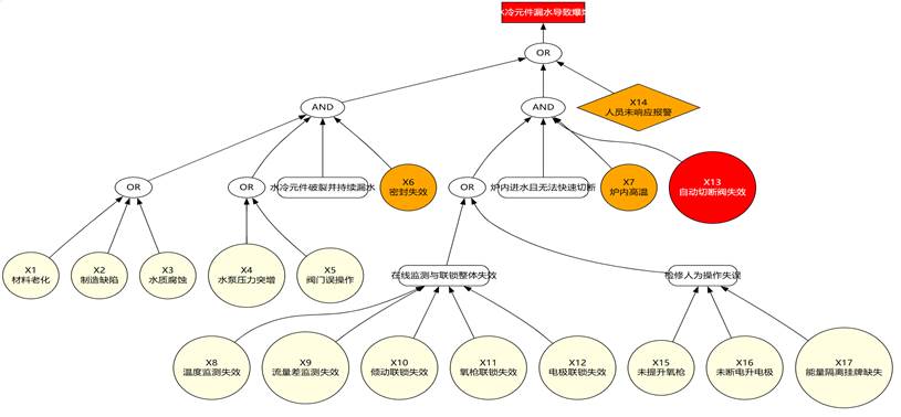 以“炼钢炉水冷元件漏水导致爆炸”为顶事件进行故障树分析 |