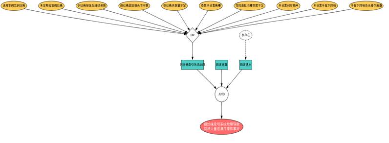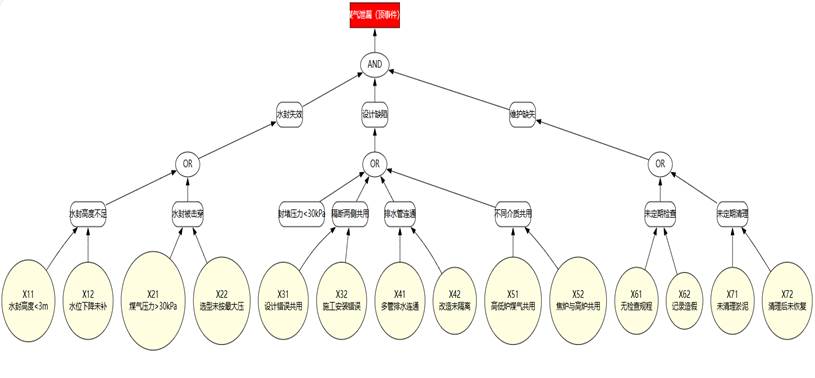 以“水封排水器失效导致煤气泄漏”为顶事件进行故障树分析 |