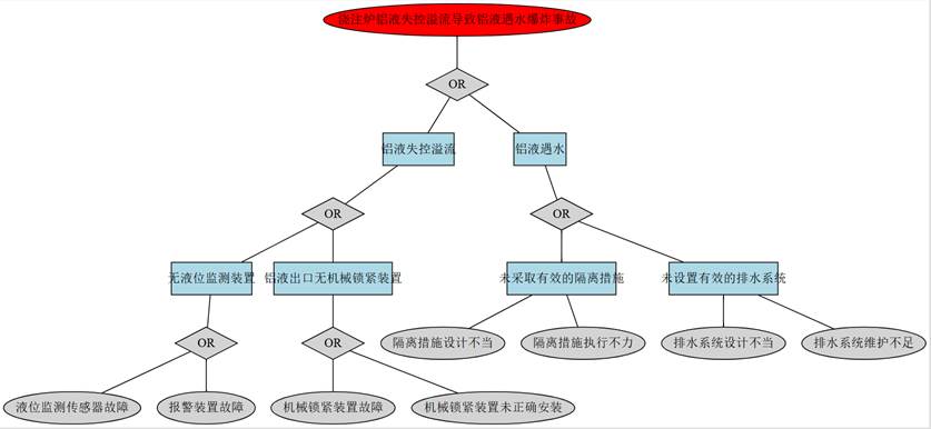 以“浇注炉铝液流量失控导致铝液遇水爆炸事故”为顶事件进行故障树分析 |