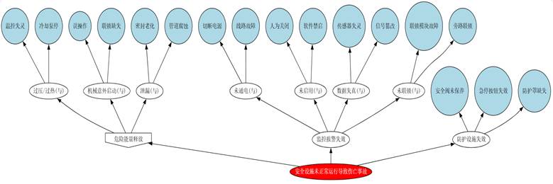 以“安全设施未正常运行导致伤亡事故”为顶事件进行故障树分析 |