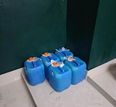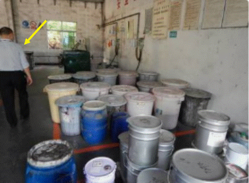 危险化学品在车间现场随意堆放,未入仓 |